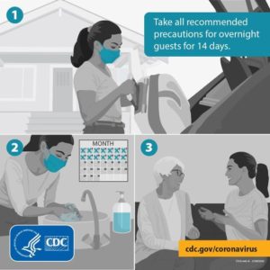 Travel can increase your risk of getting and spreading COVID-19. If traveling to visit family or friends, you should be thought of as an overnight guest and take all recommended precautions for 14 days upon arrival: